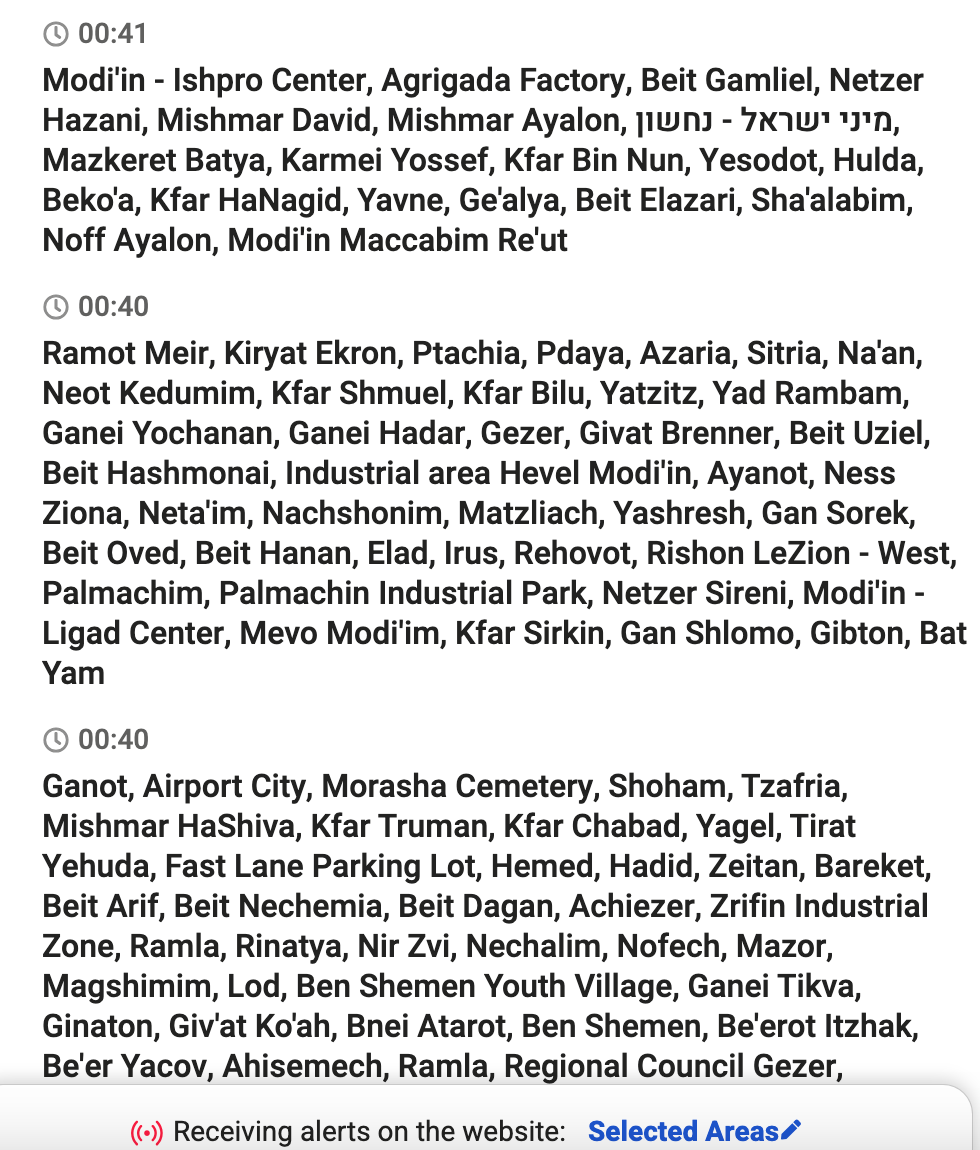 But for longer range missiles that are considerably larger and can carry a bigger explosive payload, different defense systems, such as “David’s Sling” and “Arrow” are deployed. And because the interceptions are done at a significantly higher altitude, there is a larger radius of where the remains of the interception (the “debris” from the larger missile and of the interceptor) can fall. Thus, last night, there was a missile alert in my city, even if when interception too place “outside Israel’s territory.”A screenshot showing some of the towns and cities that had a missile alert from the ballistic missile last night.