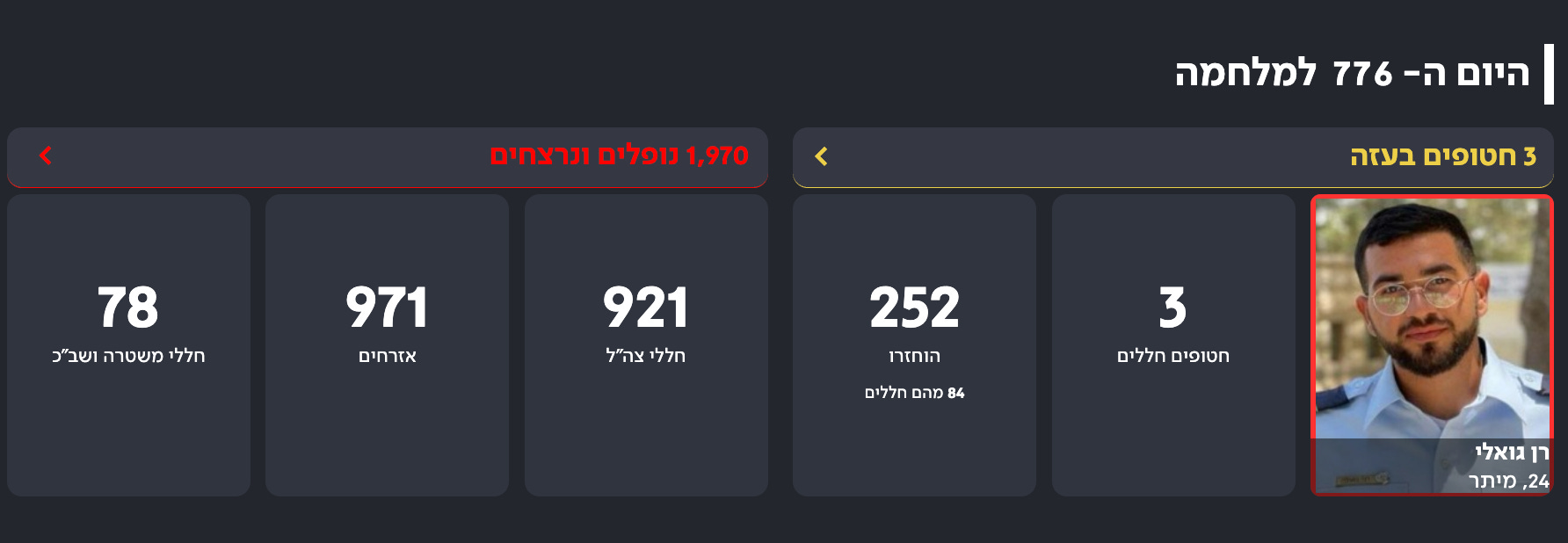 This morning I spent a good five minutes looking at the newly formatted “war infographic” of the Kan broadcast company. What used to be a long carrousel of photos switches now only between the photos of three hostages.